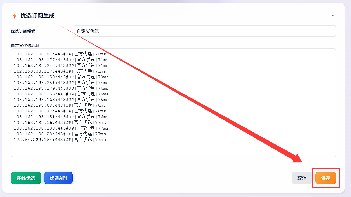 - 自由度最高,适合喜欢折腾的选手,提供在线优选和优选API,等多种优选接入方式,在线优选可以自选落地国家,使用优选API可以实现自动化实时优选!