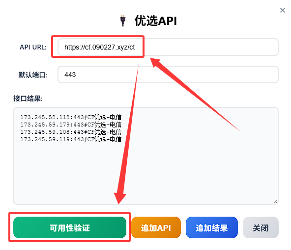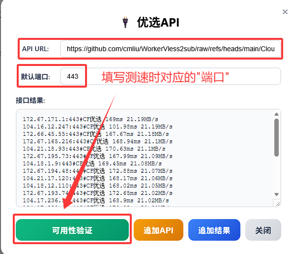 https://github.com/cmliu/WorkerVless2sub/raw/refs/heads/main/CloudflareSpeedTest.csv,填写测速对应的默认端口后,点击可用性验证按钮;如返回格符合